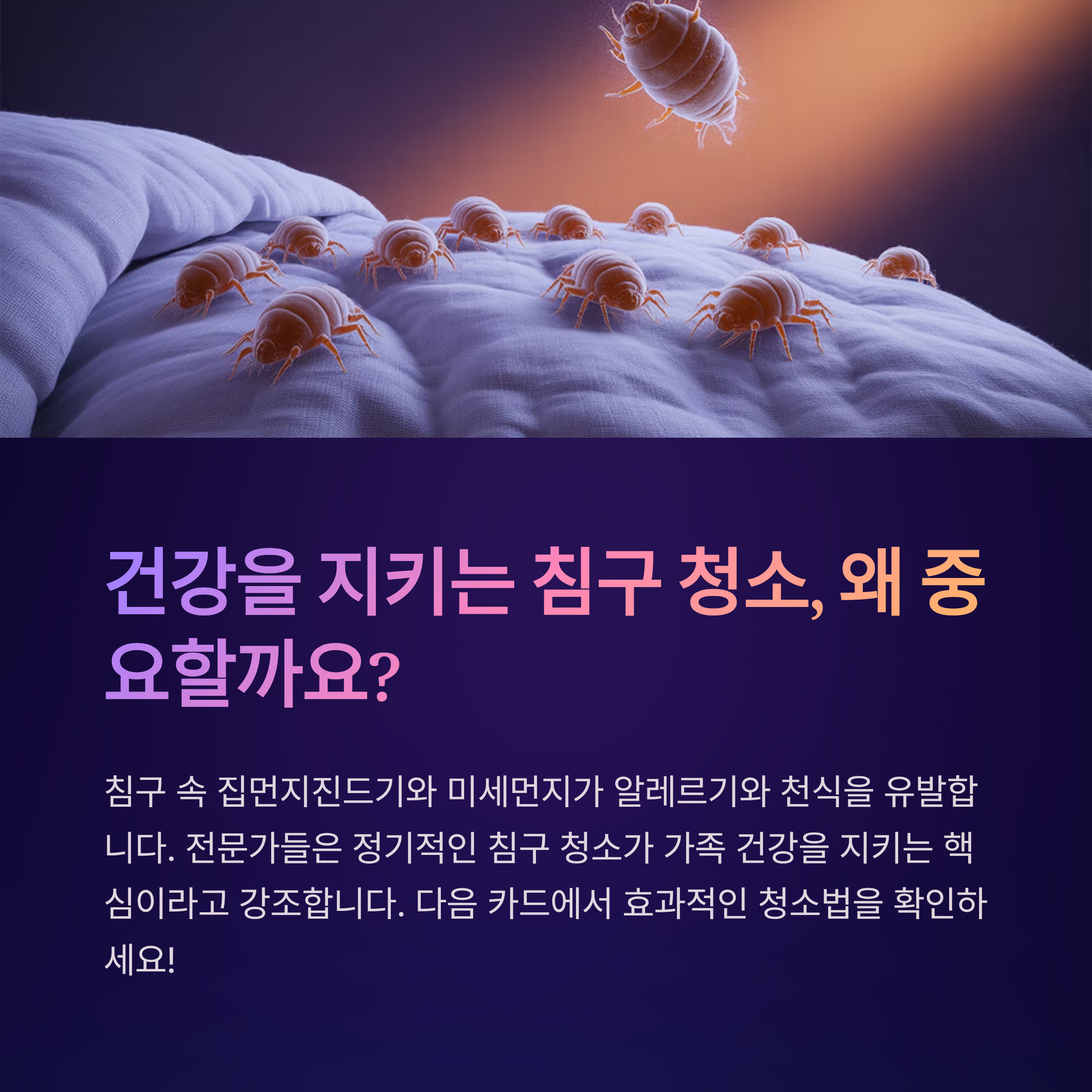 침구 관리를 소홀히 하면 안 되는 이유! 🌞 여러분 먼지사냥꾼처럼 침구의 숨은 진드기와 미세먼지를 잡아내며 건강과 직접 연결되는침실 관리를 시작해보세요. 최근 데이터 분석에 따르면, 알레르기 발생률이 증가 추세인데요, 여러분도 직접 부딪히며경험해 보셨다면 아실 거예요. 깨끗한 침구는 피곤한 하루를 더 편안하게 마무리할 수 있게 해줍니다. 오늘도 먼지사냥꾼처럼알려드릴 꿀팁으로 침구를 건강하게 관리해보세요.😃'침구를 잘 관리하면 가정의 건강도 챙길 수 있어요!'알레르기로 고생하시는 분들 많죠? 요즘 같은 시기에 고온세탁이나 주간 관리로 증상을 줄여보는 게 얼마나 중요한지생각하게 되네요. 매주 세탁하거나 햇볕에 잘 말려주는 것만으로도 효과가 대단합니다. 디테일한 청소법을 직접 해 본 결과,침구 청소기를 사..
