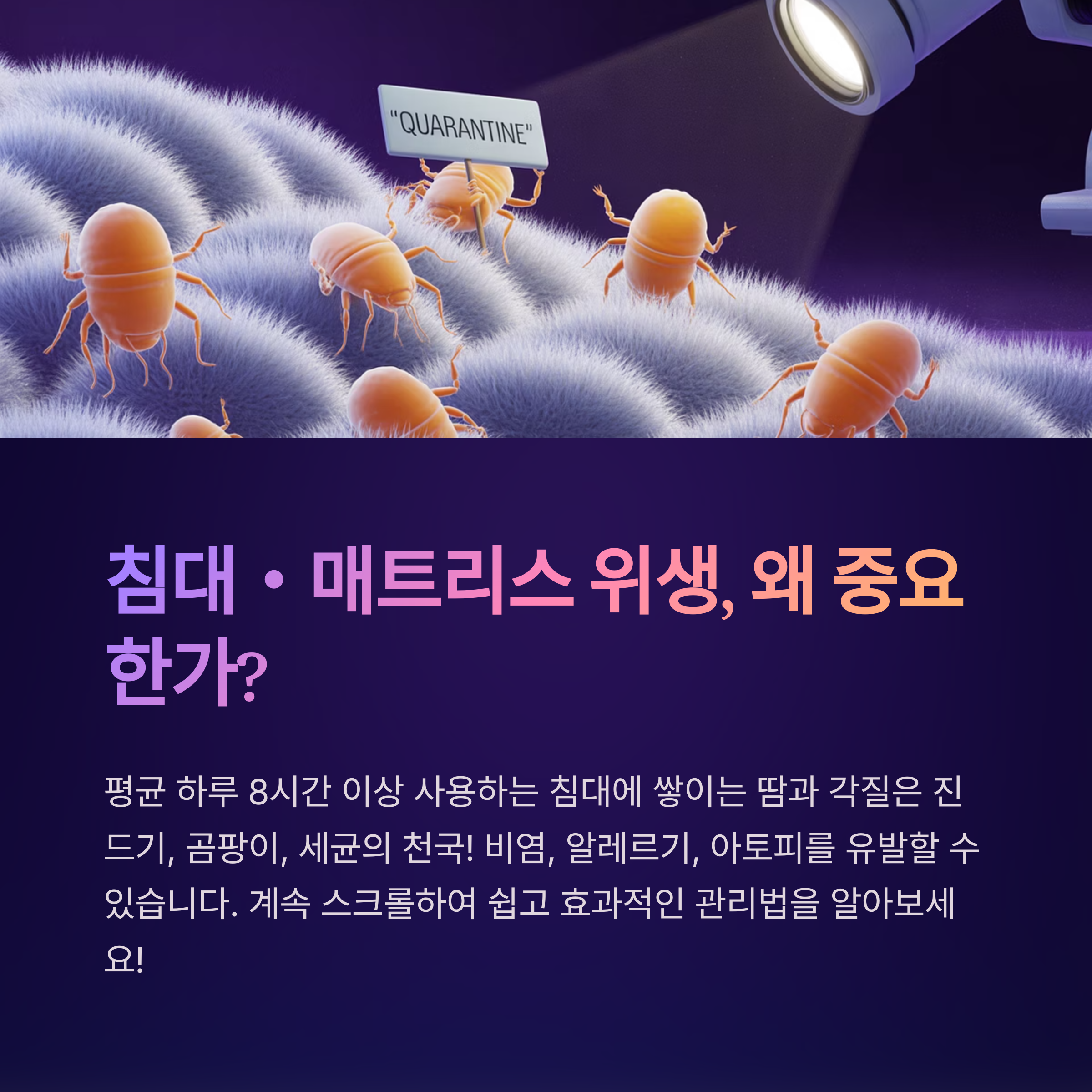 침대는 우리 생활에서 중요한 부분을 차지하고 있습니다. 하지만 청소와 관리가 쉽지 않아 고민이신가요? 먼지사냥꾼으로서, 집에서도 손쉽게 구현할 수 있는 침대 청소 방법을 소개합니다. 깨끗한 침구는 더 건강한 수면 환경을 만듭니다. 당신의 침대, 이제 더 이상 먼지와 세균의 놀이터가 아닙니다!목차매트리스 표면 청소진드기 및 세균 제거습기 및 냄새 관리매트리스 커버 사용의 중요성청소 전후 효과 및 금액효율적인 청소 주기 및 방법1. 매트리스 표면 청소매트리스의 표면은 땀, 피지, 먼지 등이 쌓이고 세균의 번식처로 변하기 쉽습니다. 이를 예방하기 위해 매트리스 표면 청소는 필수입니다. 시중에 구할 수 있는 굵은 소금과 베이킹소다를 약 250g씩 준비해 주세요. 이 두 재료는 비용이 저렴해 누구나 접근하기 쉬운..