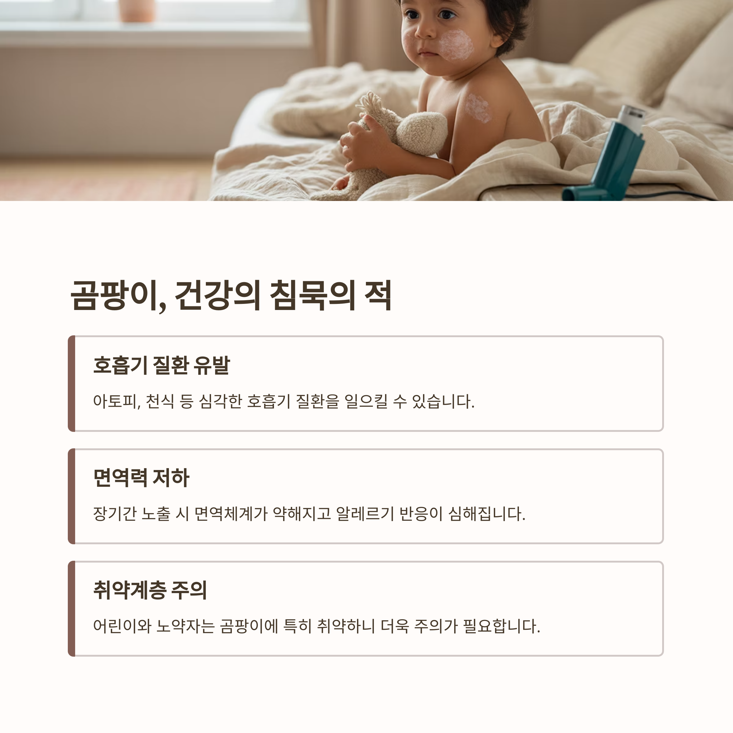 곰팡이를 즉시 제거하지 않으면 포자가 공기 중에 퍼져 더 넓은 면적으로 확산됩니다. 이는 실내 공기질을 악화시키고, 건강에도 해로울 수 있습니다. 특히, 아토피피부염과 천식 같은 호흡기 질환의 위험이 증가할 수 있습니다.