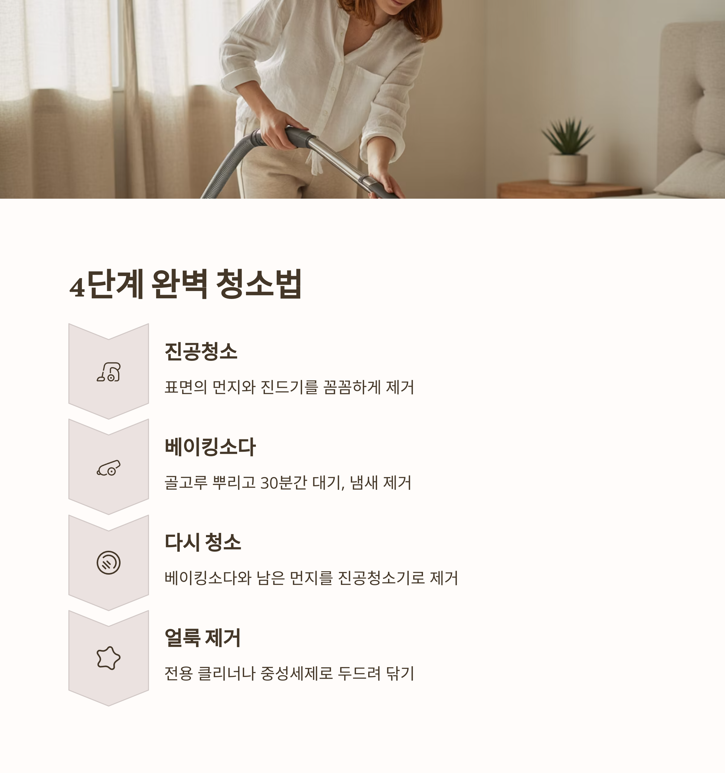 | 베이킹소다 도포 및 흡입 | 냄새 및 잔먼지 흡수 | 베이킹소다 30분 방치 |