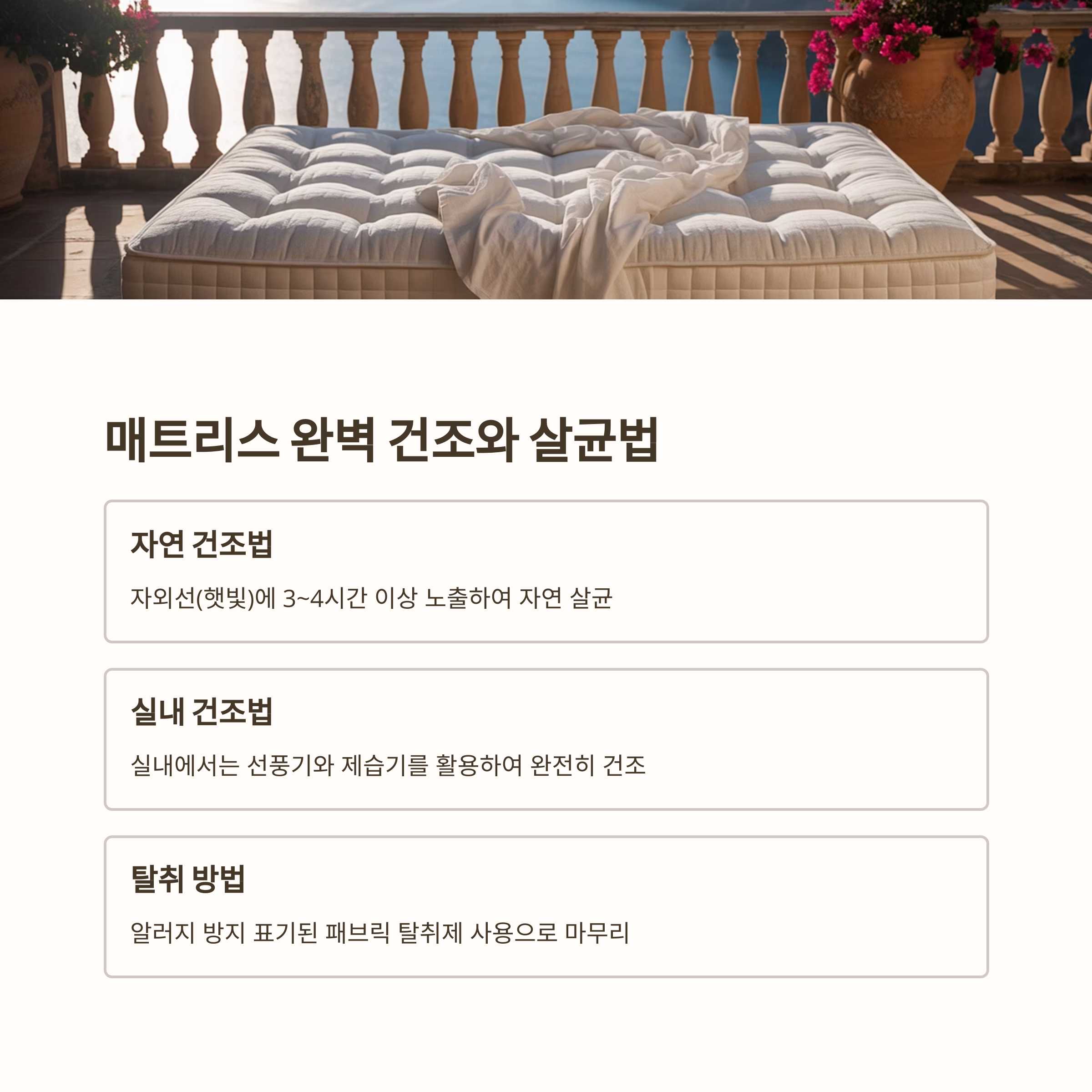 | 햇볕 건조 또는 자외선 살균 | 자연 살균 및 습기 제거 | 균 및 진드기 감소 |