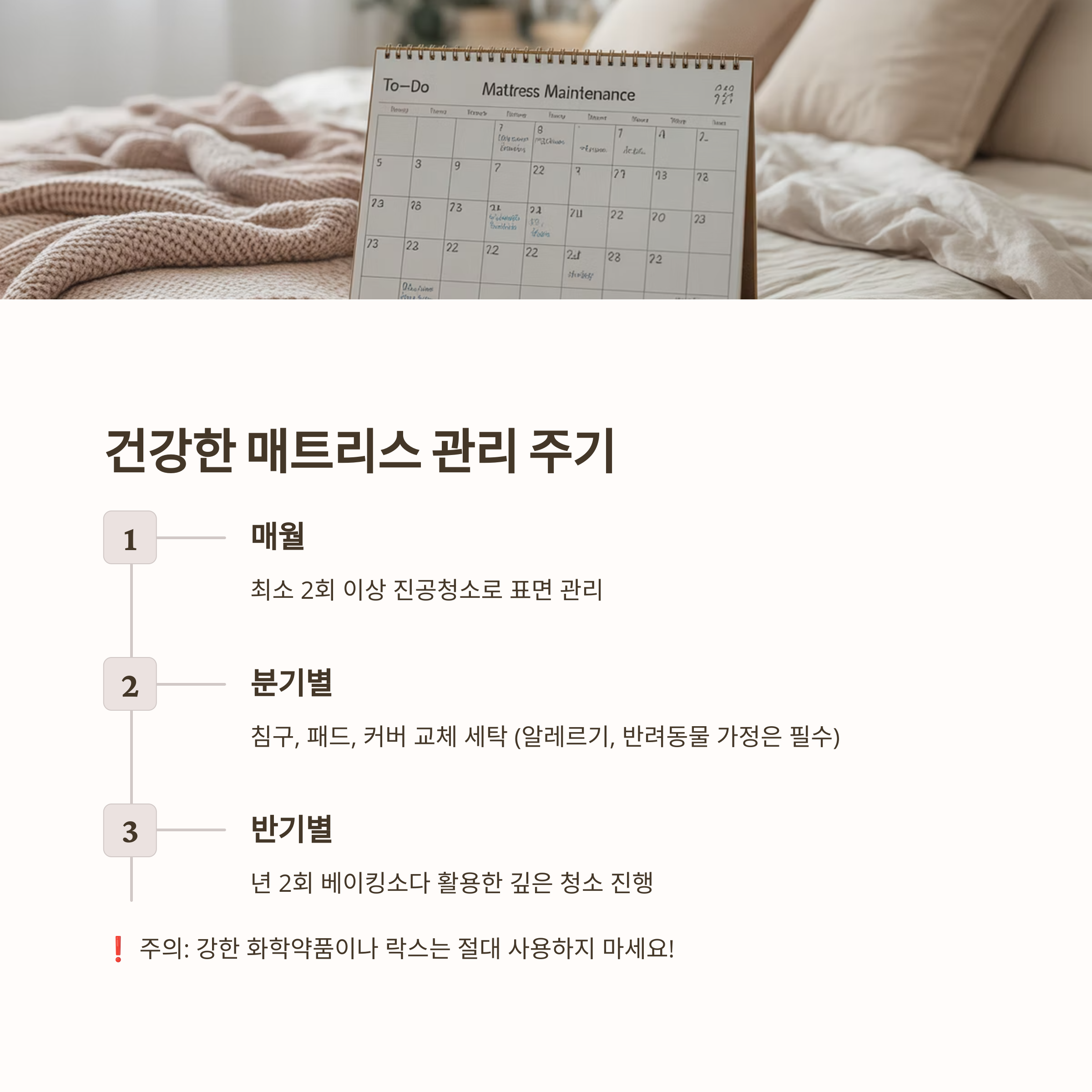매트리스의 청결은 일상적인 수면의 질을 결정짓는 중요한 요소입니다. 청소의 빈도와 방법을 잘 관리하면 알레르기, 호흡기 질환 등의 건강 문제로부터 자신을 보호할 수 있습니다. 특히 체계적인 프로세스와 데이터 기반의 관리법은 한층 더 효과적입니다. 이 가이드가 여러분의 매트리스 관리에 유용한 도구가 되길 바랍니다. 이제 매트리스를 깨끗하게 유지하는 노하우를 갖춘 여러분은 비교적 적은 노력으로 큰 건강상의 이점을 누리실 수 있습니다.