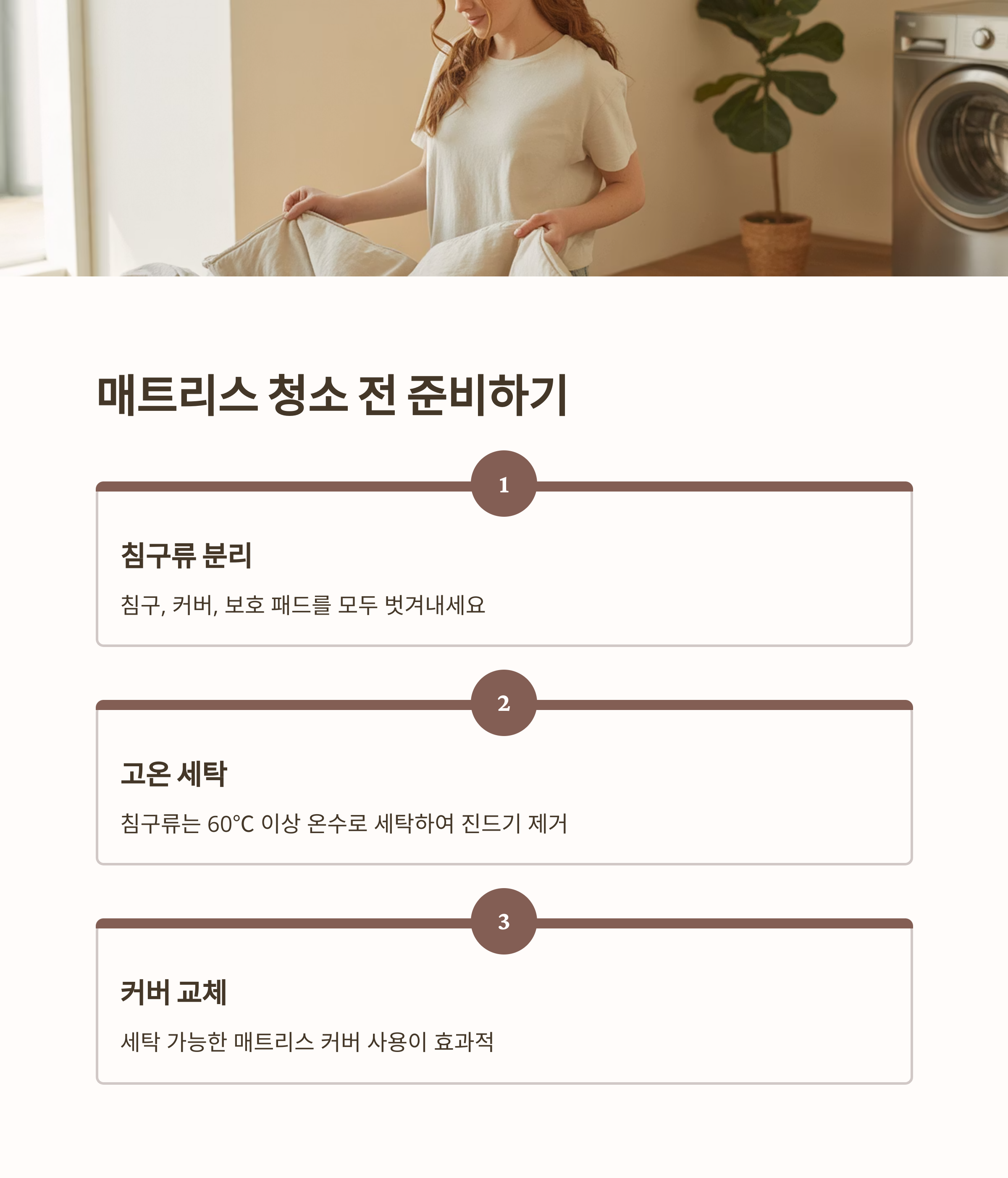 | 침구 분리 및 세탁 | 첫 단계 필수 작업 | 커버류를 분리하여 세탁 |