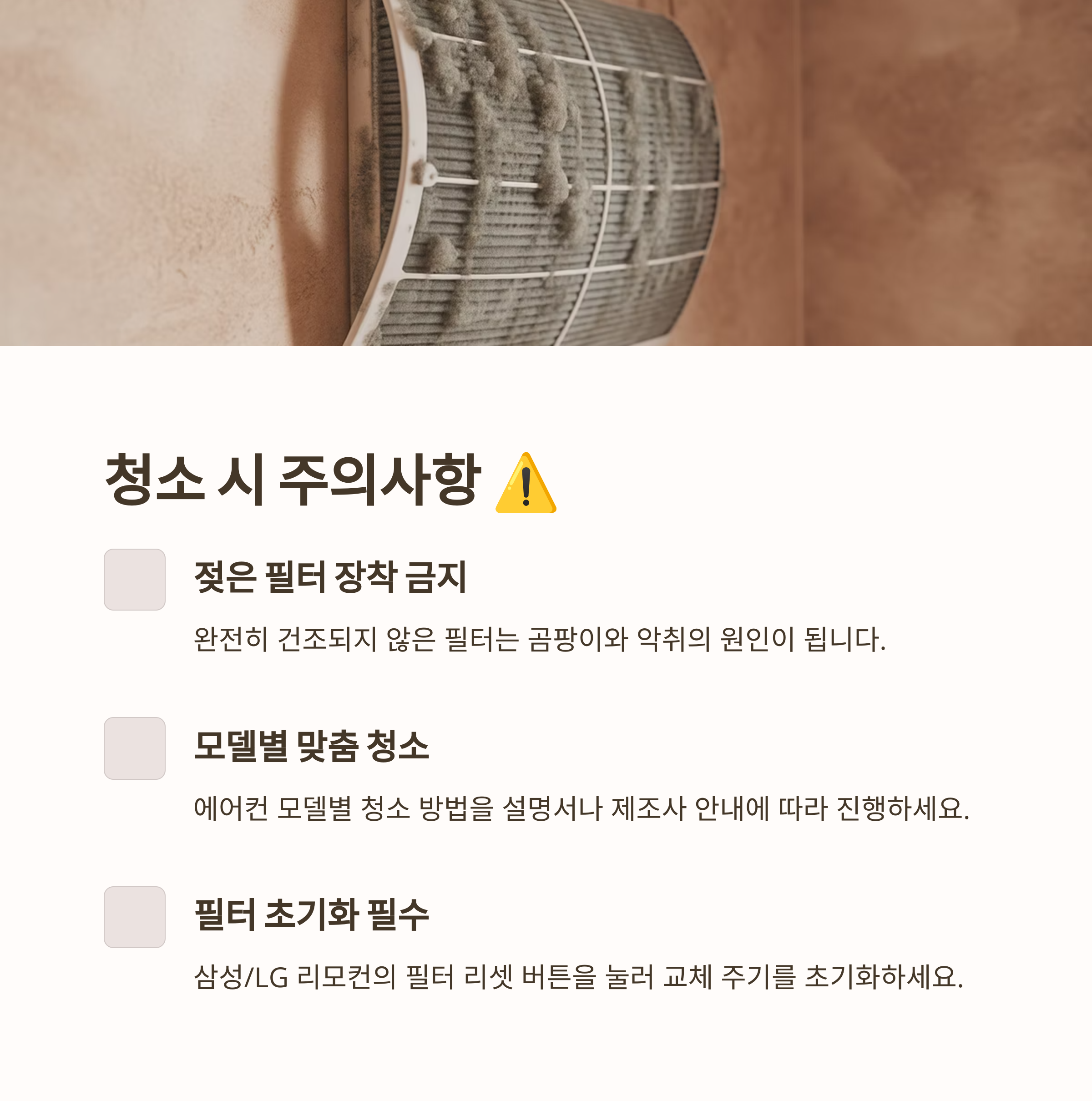 A: 필터 청소 후에는 반드시 완전히 건조시킨 후에 재조립해야 합니다. 충분히 건조되지 않으면, 에어컨 내부에 습기가 남아 곰팡이 및 세균이 번식할 수 있습니다. 또한, 청소 중에 필터가 손상되지 않도록 부드러운 소재의 브러시를 사용하고, 고온의 물은 피하는 것이 좋습니다.