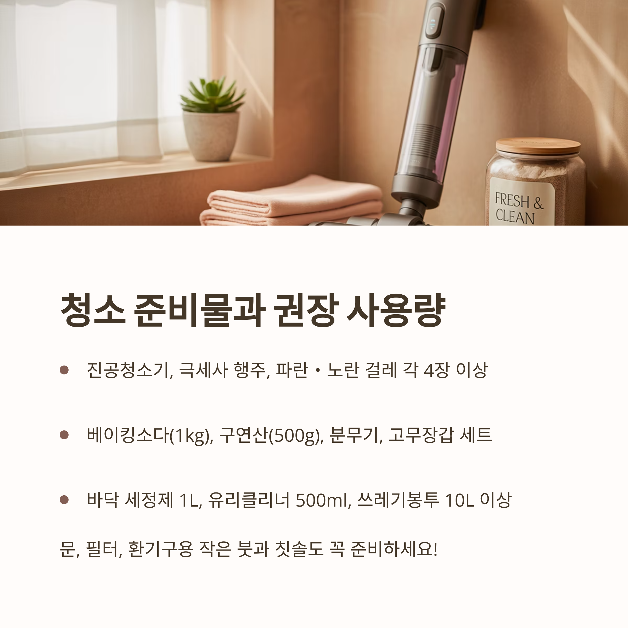 셀프 입주청소를 준비할 때 예상되는 기본적인 준비물과 비용을 미리 파악하면 계획이 훨씬 수월해져요. 84㎡ 집 기준으로 진공청소기 등 주요 장비는 꼭 필요하고, 물걸레는 10장 이상 준비해 두시는 게 좋아요. 특히 새집 냄새가 걱정된다면 마스크도 필수죠. 실제로 소요되는 시간을 정확히 예측해 비효율을 줄일 수 있습니다.