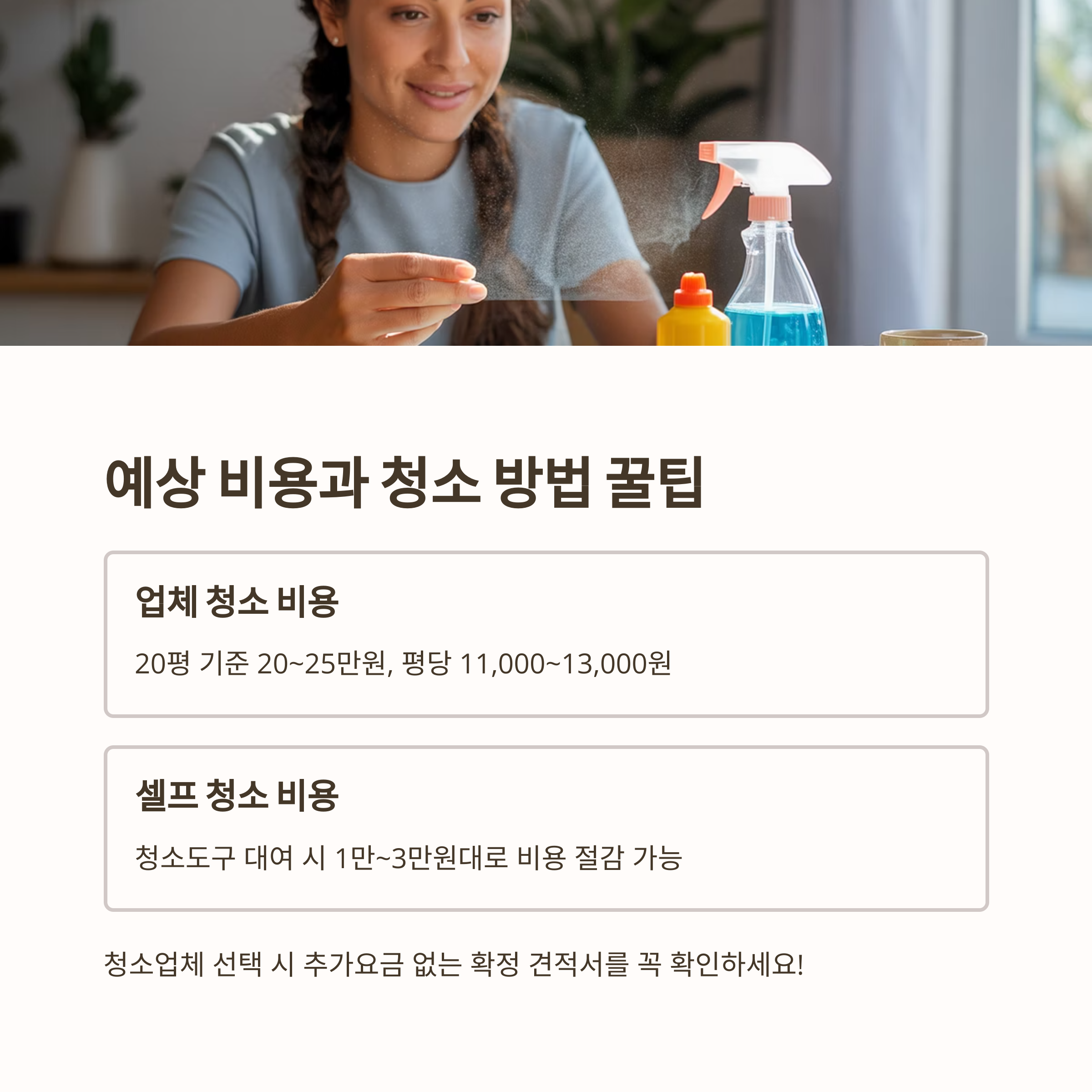 소요 시간은 5~8시간이 걸리며 바닥, 창문, 욕실은 최소 3회 이상 반복 청소가 필요합니다. 전체 예산은 셀프 청소 시 4~6만원, 업체에 맡길 경우 18~36만원이 소요됩니다. 특히 입주 전후의 청소 수요가 많아질 때에는 평균 20%의 추가 요금이 발생할 수 있습니다. 청소 후에는 체크리스트를 통해 사진 인증 및 모바일 확인까지 마무리해야 완벽한 준비가 이루어질 수 있습니다.