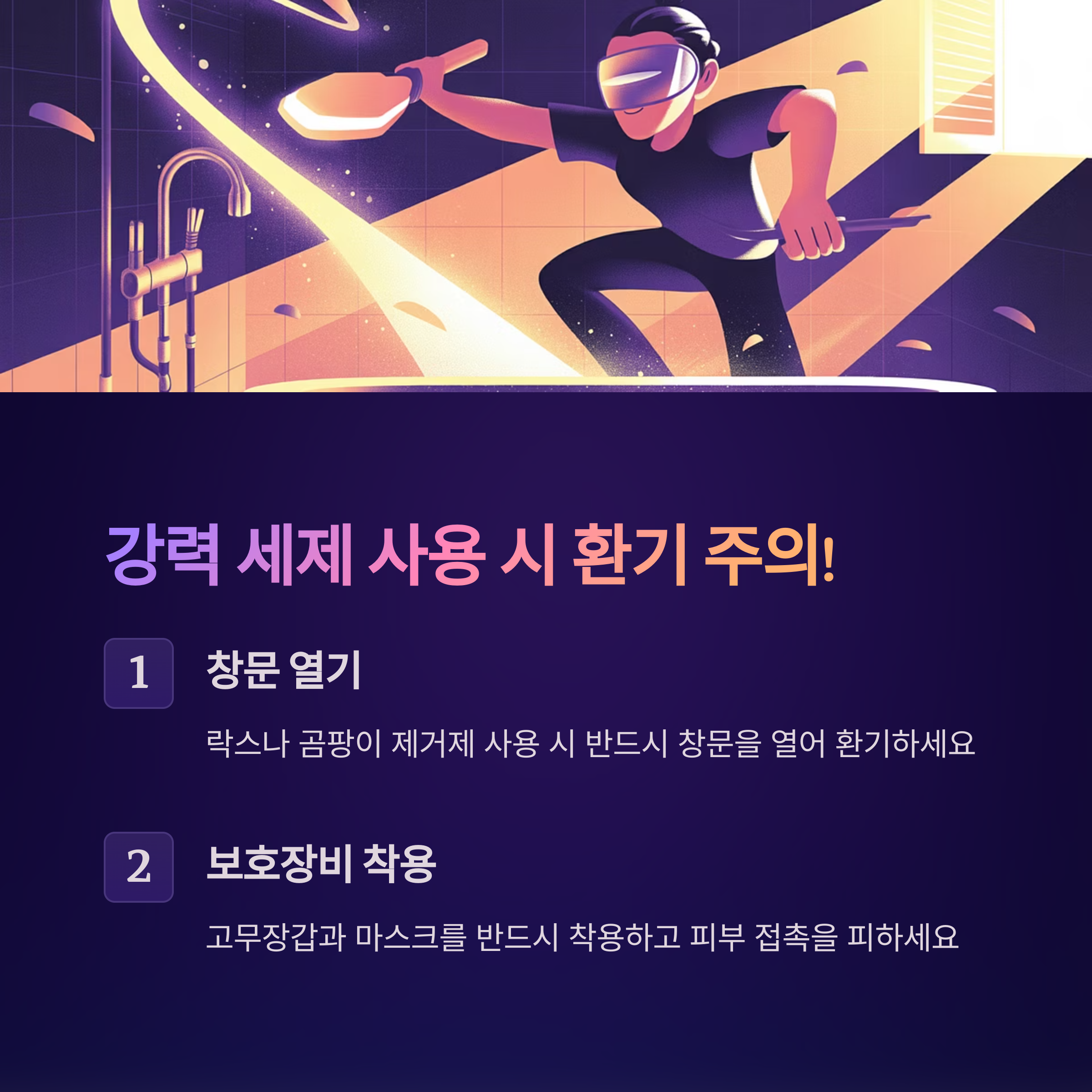 청소를 할 때는 사용하는 재료와 환경에 주의해야 합니다. 산성 세제나 식초는 대리석이나 석회질 타일에 사용하지 않는 것이 좋습니다. 이러한 표면에 사용할 경우 손상될 수 있기 때문이죠. 강한 약품을 사용할 때는 반드시 환기를 잘 시키고, 고무장갑과 마스크를 착용하여 피부와 호흡기를 보호해야 합니다. 전문가들은 색 줄눈에는 산소계 표백제를, 흰색 줄눈에는 염소계 표백제를 추천합니다. 이렇게 재료별 맞춤 사용을 통해 더욱 안전하고 효과적으로 청소할 수 있습니다.