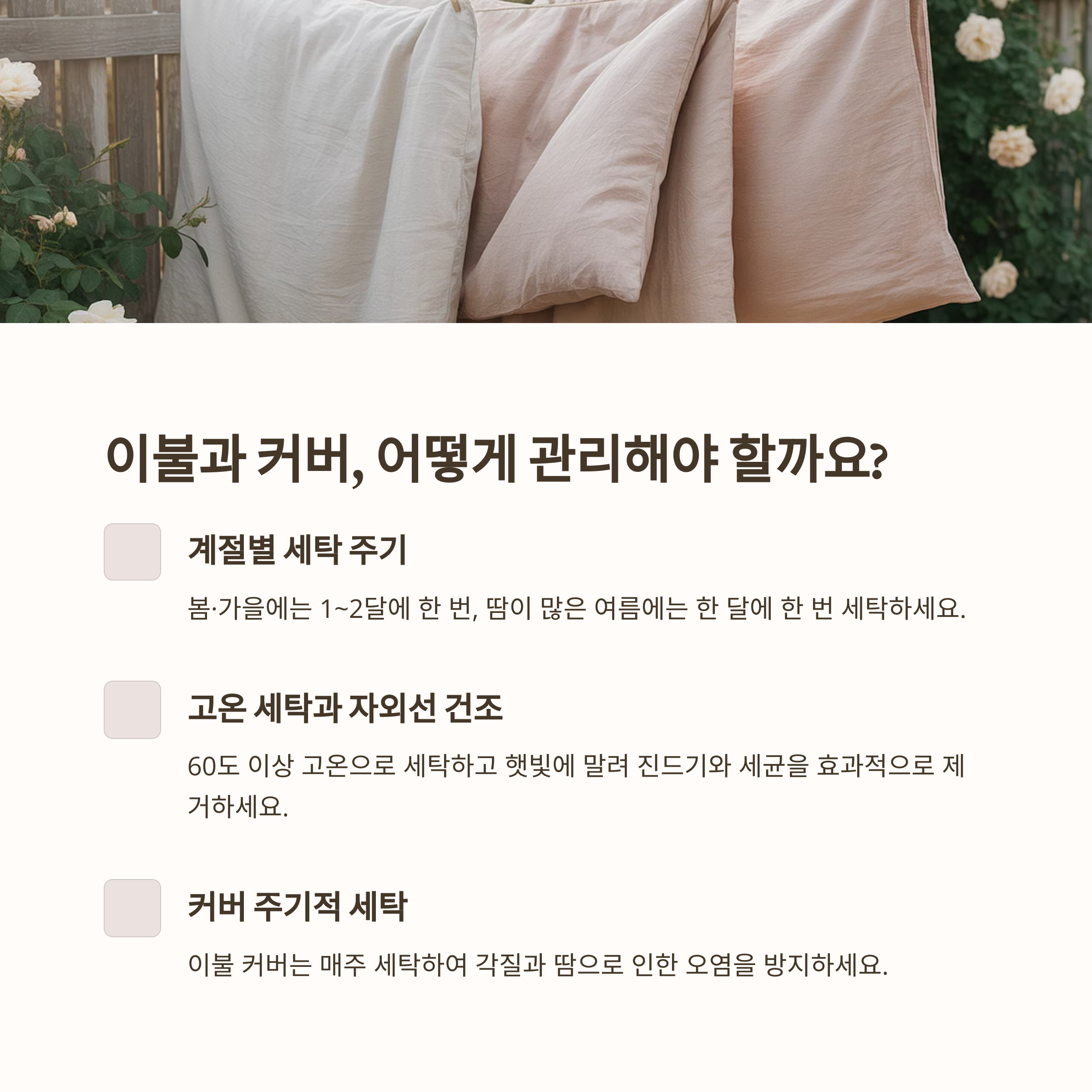 | 여름 이불 | 주 1회 | 고온 세탁 후 자외선 건조 |