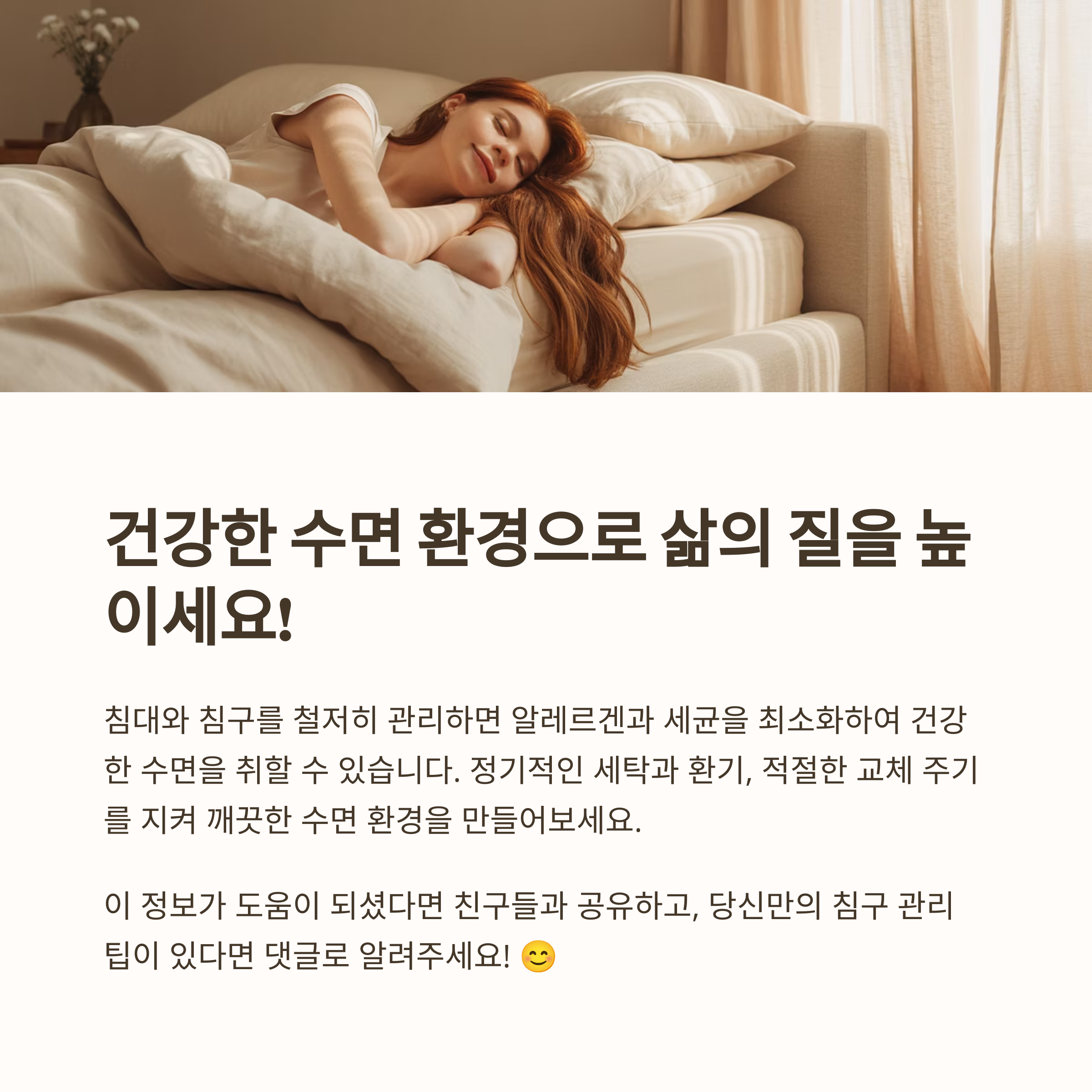 매일 아침 맑고 상쾌한 기분으로 시작하고 싶으신가요? 그렇다면 침구류 관리 또한 필수입니다. 언제나네님도 아시다시피, 여기에서 배우실 침대청소 가이드는 매트리스, 이불, 베개를 완벽하게 관리하는 방법을 알려드립니다. 이 정보가 여러분의 수면 환경 개선에 큰 도움이 되길 바랍니다.