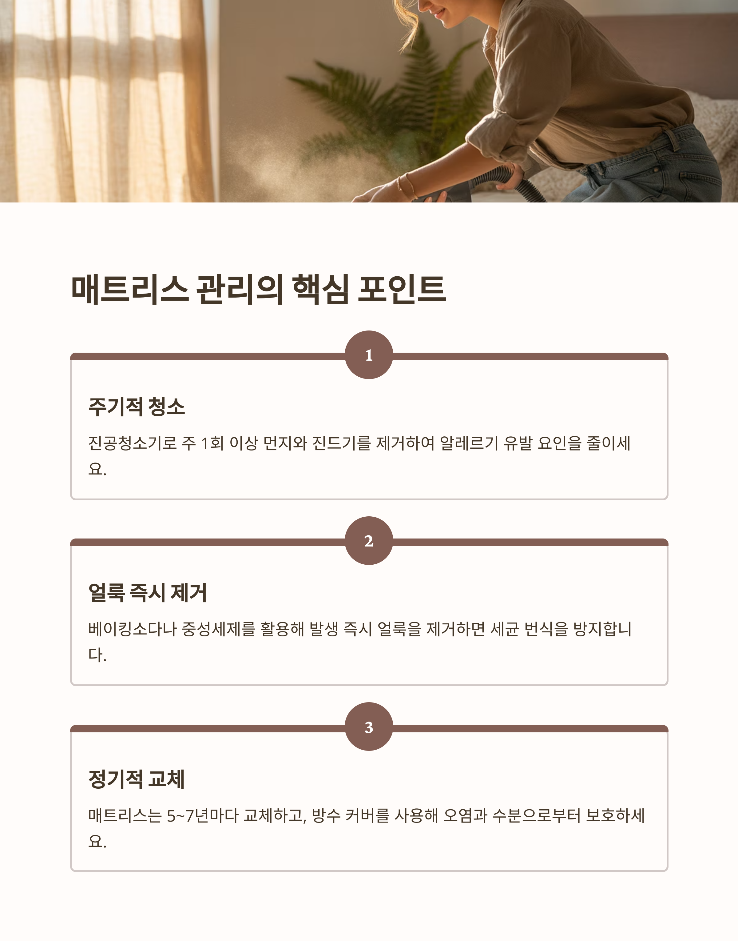 매트리스는 우리가 매일 휴식하는 공간으로, 먼지와 진드기, 그리고 각종 알레르겐의 축적 원인이 됩니다. 이를 잘 관리하지 않으면 알레르기 반응을 일으킬 수 있으며, 수면 질에 부정적인 영향을 미치게 됩니다. 따라서 주기적인 청소와 청결 유지가 필요합니다.