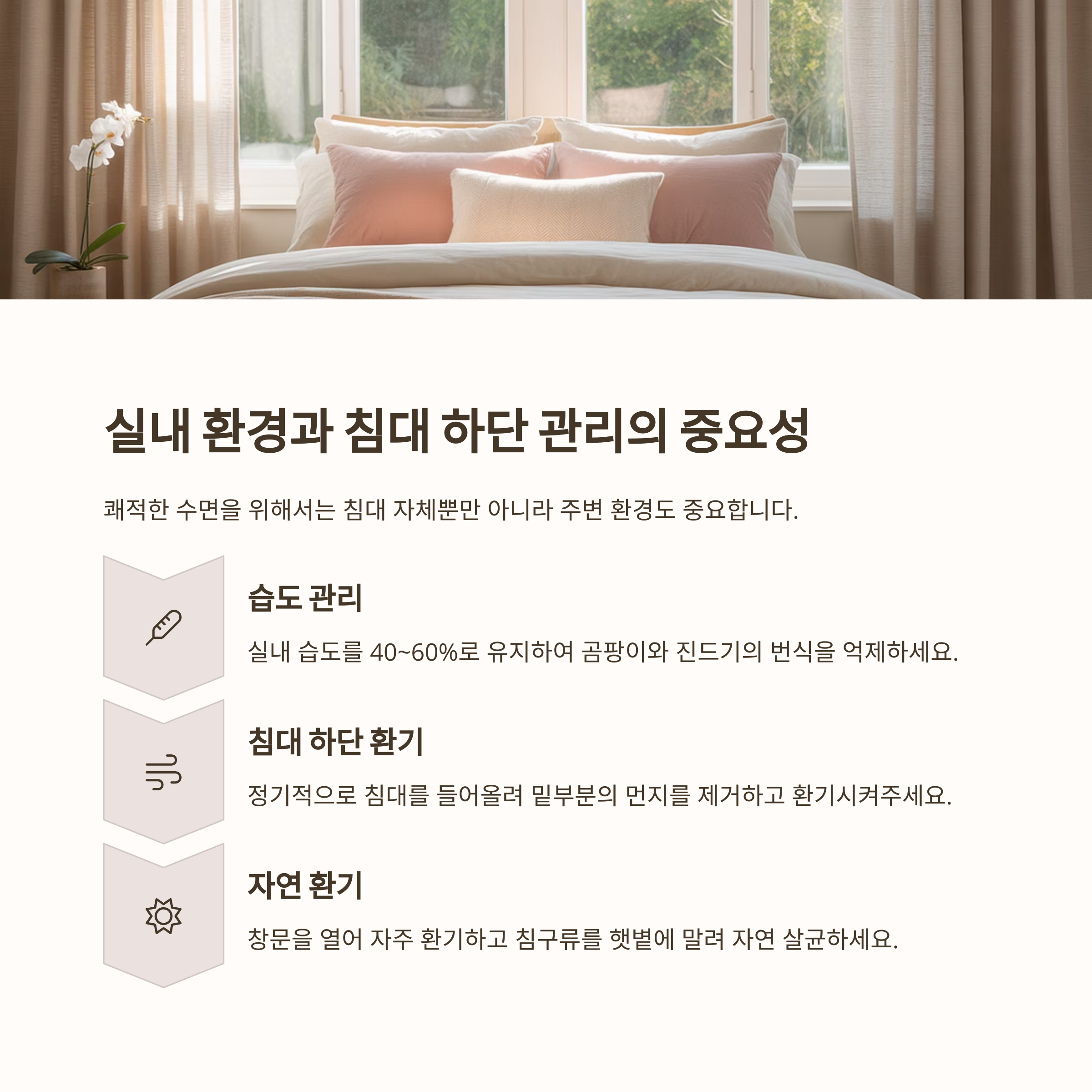 침실의 청결 수준과 함께, 온도와 습도 관리도 쾌적한 수면 환경을 위해 중요합니다. 습도 조절을 포함한 환경 관리는 수면의 질을 크게 향상시킬 수 있습니다. 특히 침실 온도는 18~22°C, 습도는 40~60%로 유지하는 것이 좋습니다. 이는 곰팡이와 세균의 번식을 억제할 뿐 아니라, 공기 중의 알레르겐을 줄이는 데 도움을 줍니다. 침대 밑의 충분한 환기도 잊지 말아야 하며, 주기적으로 공기청정기를 사용하면 알레르겐과 먼지를 억제할 수 있습니다. 여러 환경 요소를 고려하고 관리하면, 쾌적하고 건강한 수면 환경을 구축할 수 있습니다.