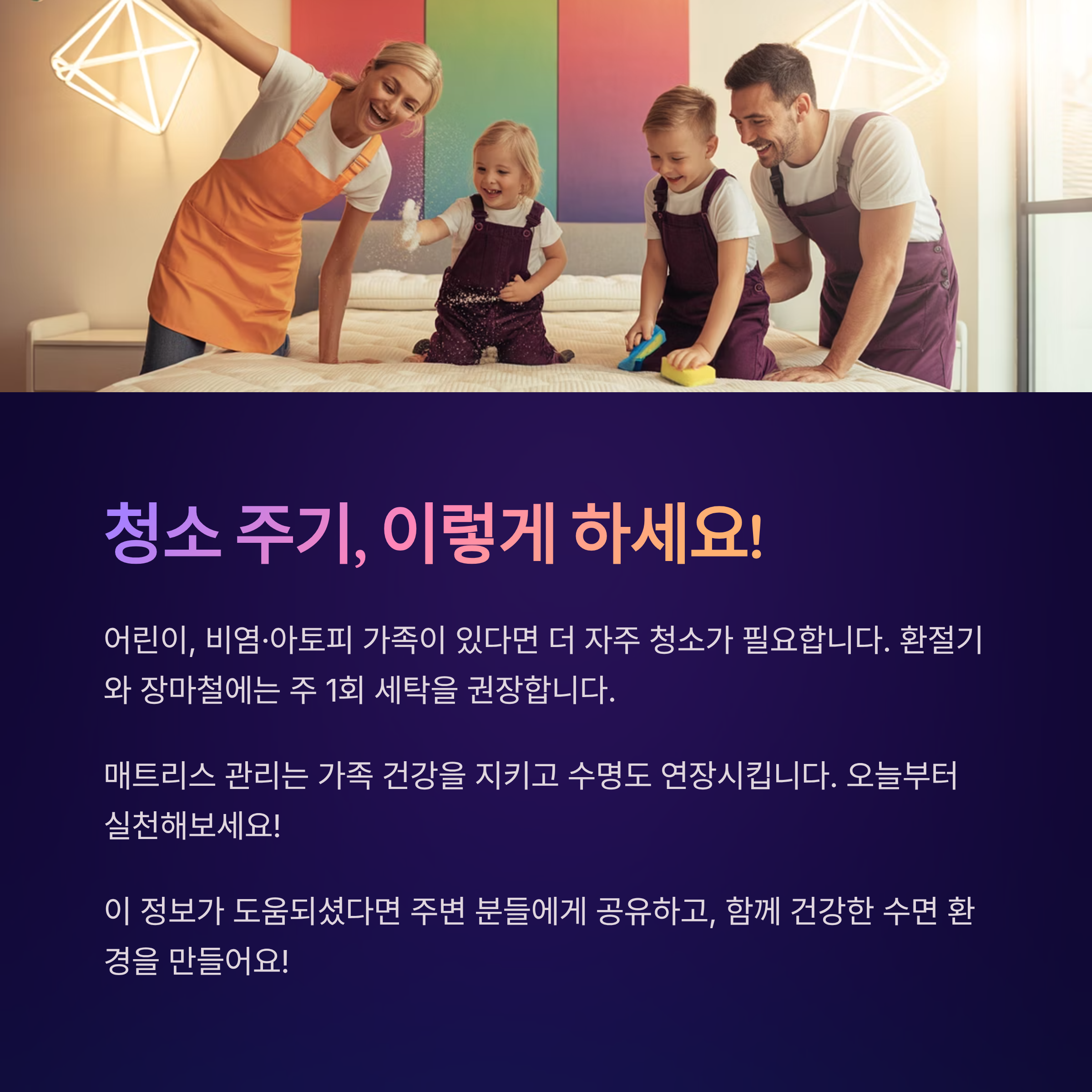 - 계절이 바뀔 때마다 매트리스를 뒤집어 내부 습기를 줄이고 곰팡이 발생을 예방해요.