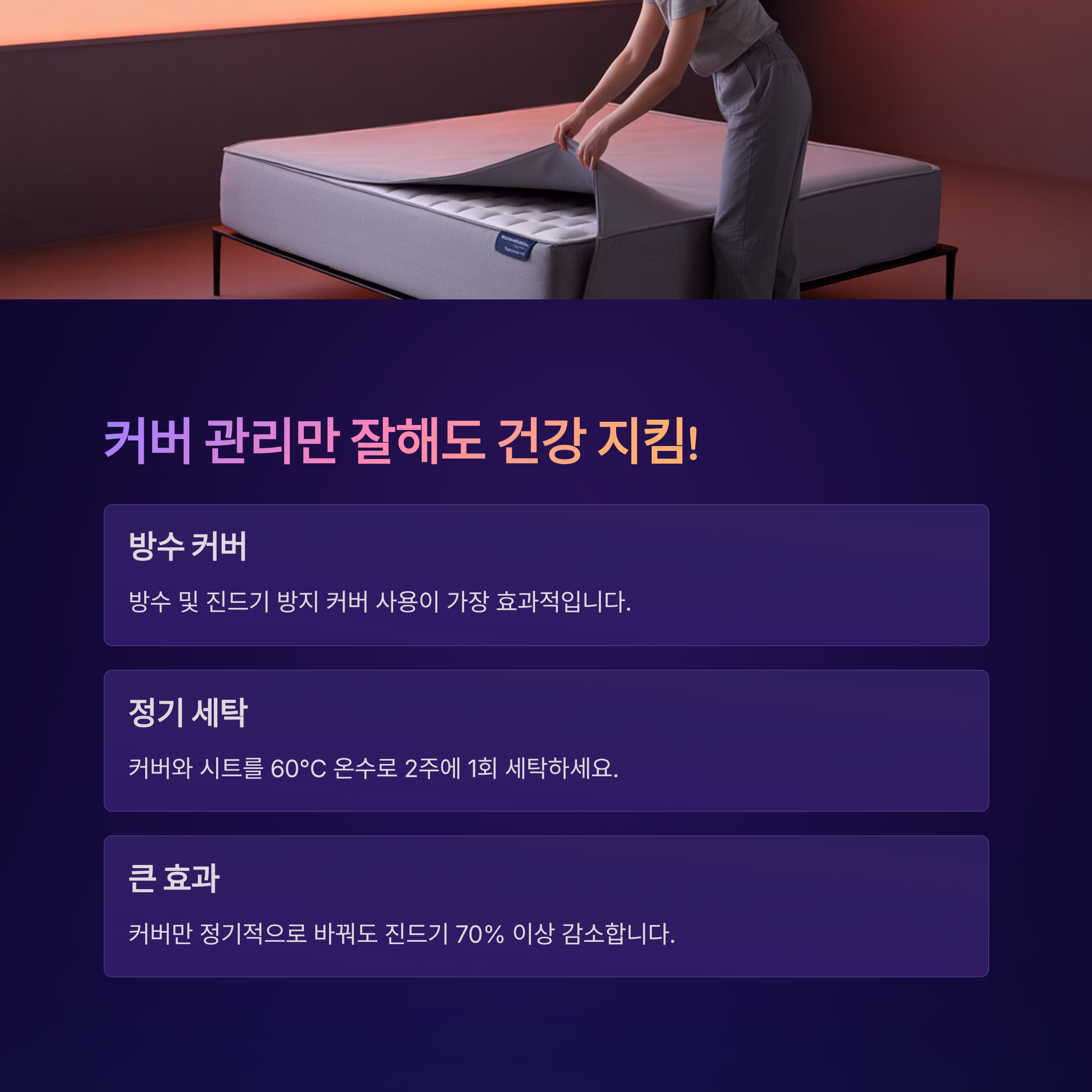 - 매트리스 커버는 2주에 한 번 이상 뜨거운 물로 세탁하여 위생을 유지합니다.