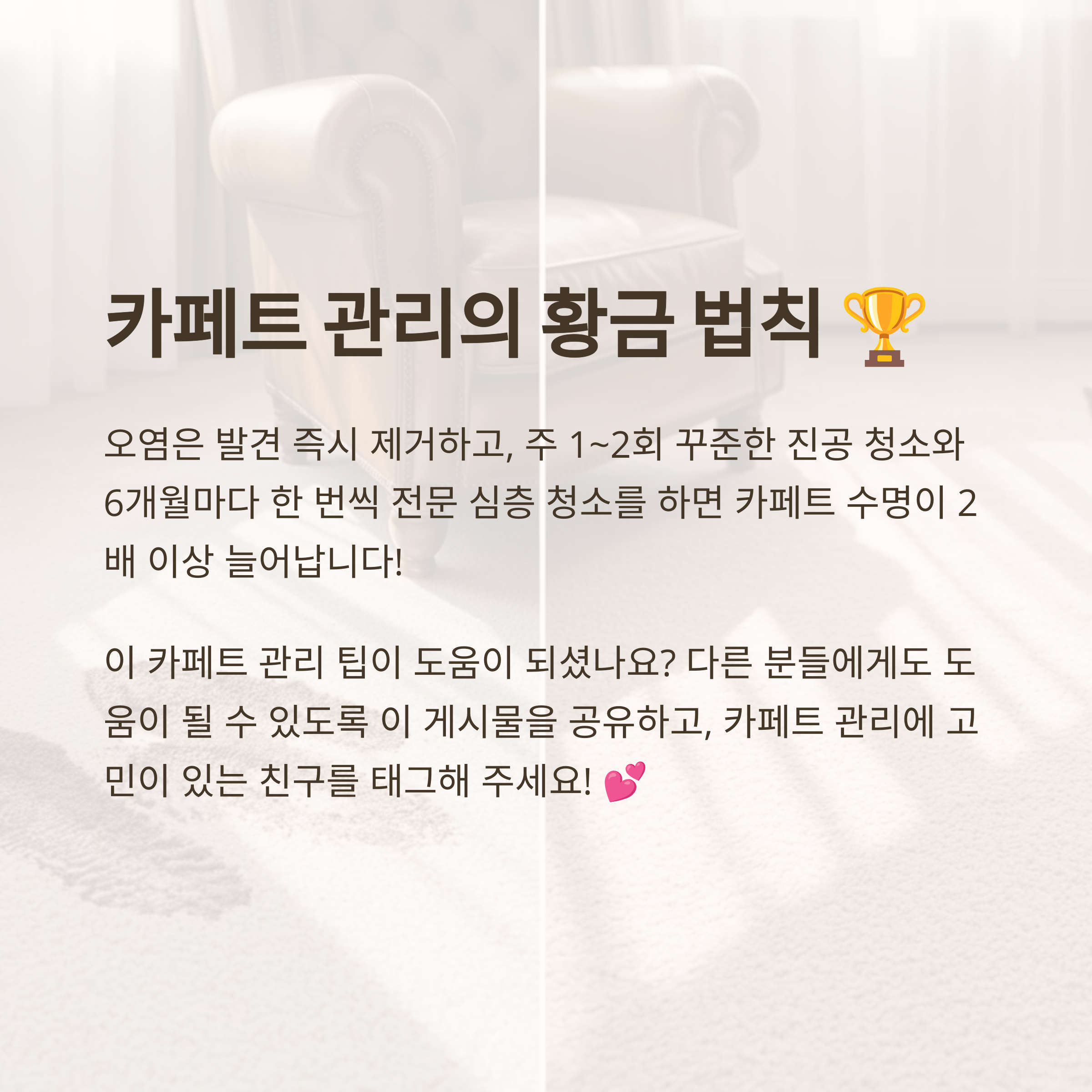 댓글로 여러분의 카페트 관리 팁을 공유해주세요! 도움이 되셨다면 공유와 구독을 부탁드립니다.