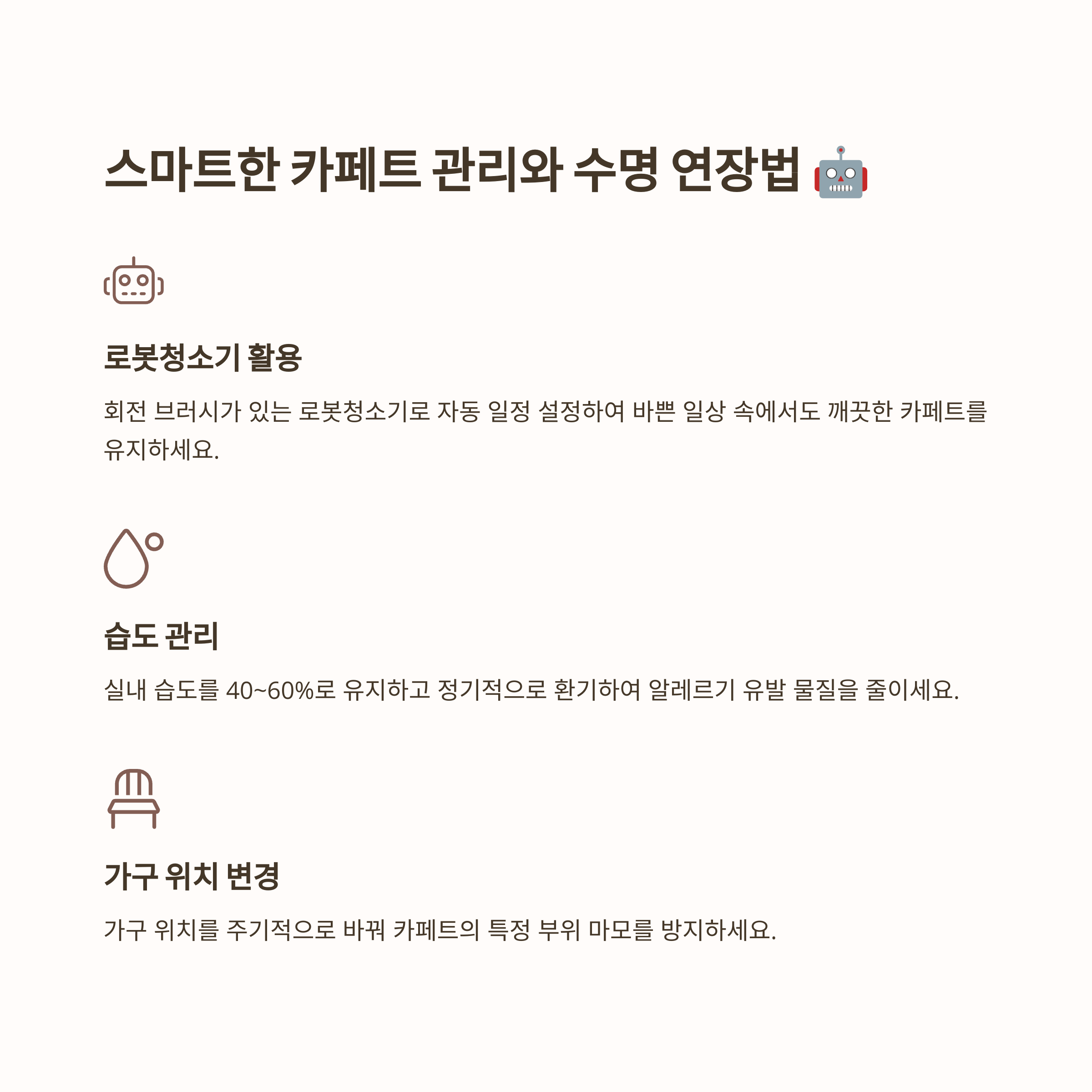 카페트는 집안의 분위기를 좌우하는 중요한 요소로서, 올바른 관리와 꾸준한 유지보수가 필수적입니다. 제시된 얼룩 제거 방법과 관리 팁을 따르면 카페트의 수명을 연장하고 미관을 유지하는 데 큰 도움이 됩니다. 또한, 자동화 기기의 적절한 사용은 관리의 효율성을 높이고 시간을 절약해 줍니다. 자주 묻는 질문 섹션에서 제공된 팁과 함께 가정에서 쉽게 실행할 수 있는 세정 방법들을 활용해 실내 환경을 보다 쾌적하게 만들 수 있습니다.