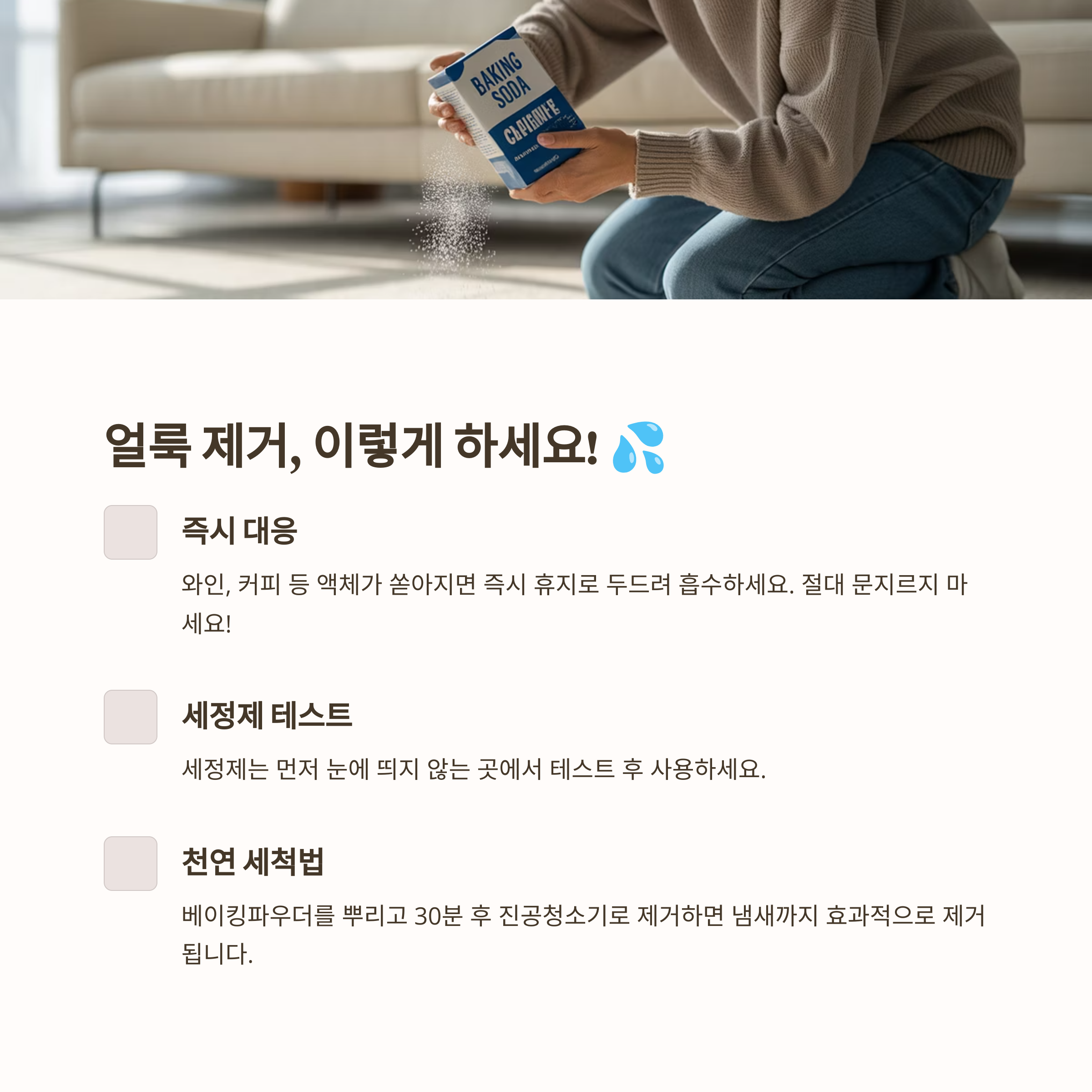 | 베이킹소다 사용 | 얼룩 위에 고루 뿌리기 | 냄새와 잔여 오염물 제거에 효과 |