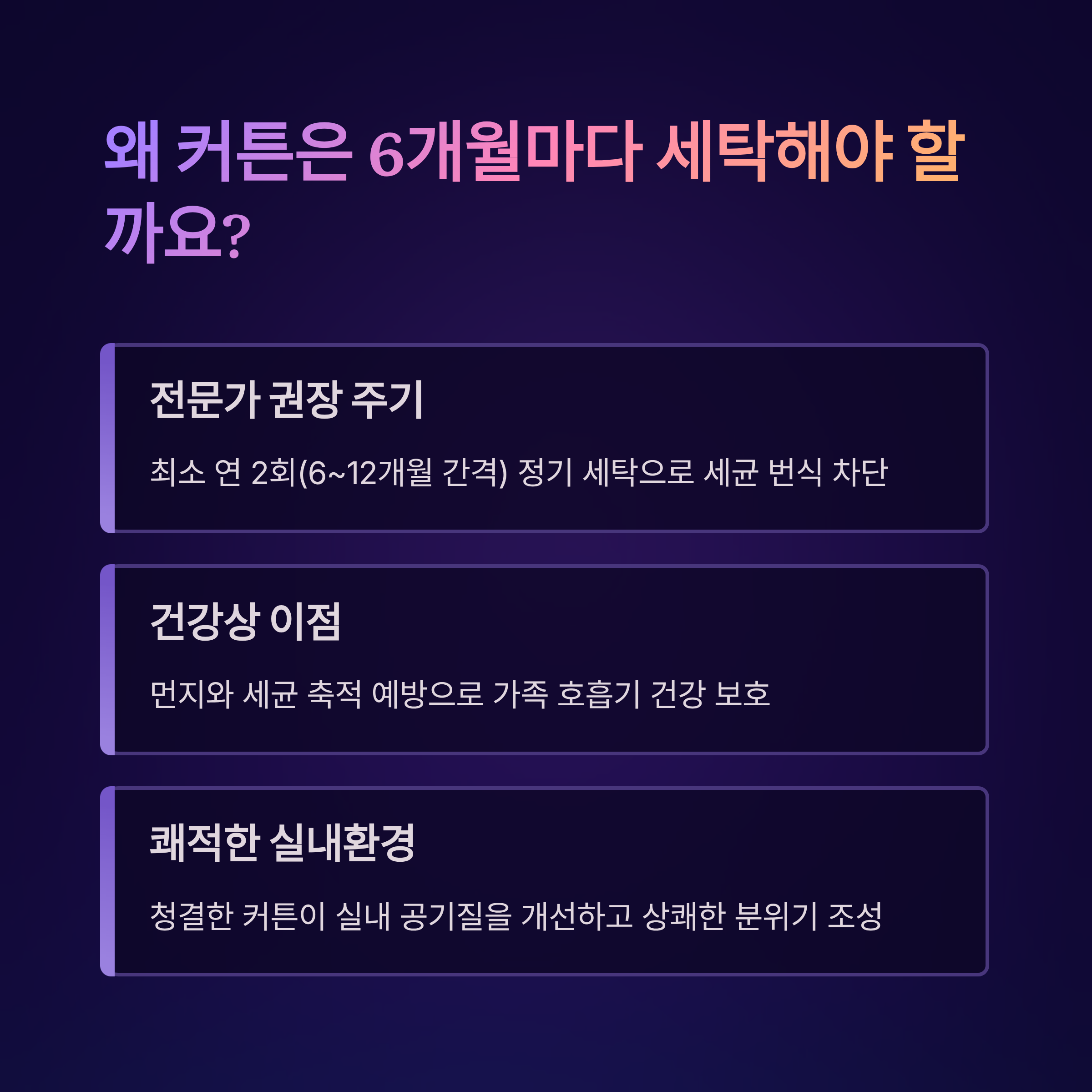 세탁 주기를 지킴으로써 커튼에 축적된 먼지와 알레르기 원인물질을 제거할 수 있어요. 주기적으로 세탁하면 커튼의 수명이 연장될 뿐 아니라 실내 공기 질도 상당히 개선됩니다. 특히 봄과 가을처럼 오염물이 많아지는 계절에 맞춰 세탁하면 건강관리에 더욱 효과적입니다.