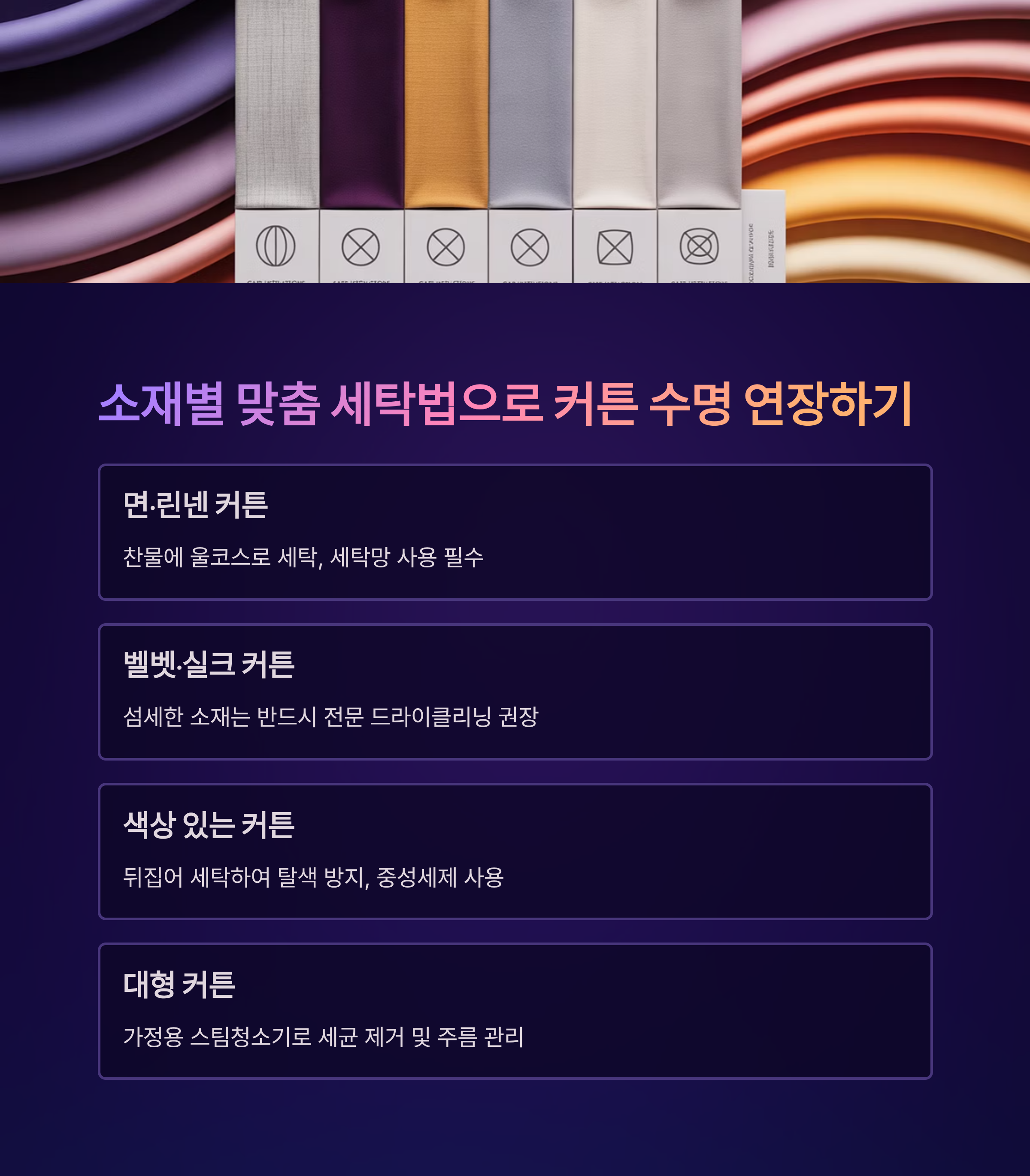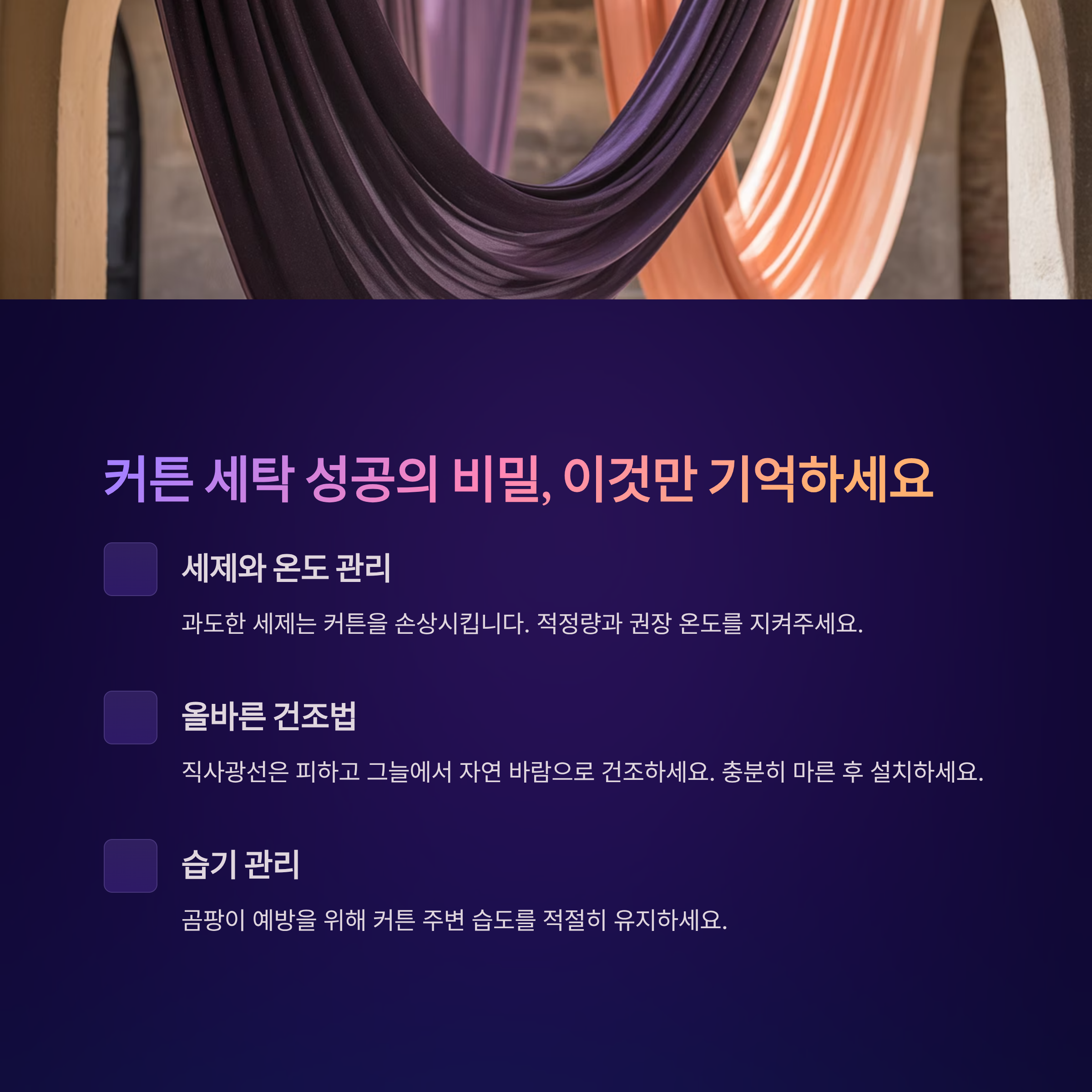 다양한 소재의 커튼이 있는 만큼, 그에 맞는 세탁법을 알고 실천하는 것이 중요합니다. 잘못된 세탁법은 커튼의 기능을 떨어뜨리고, 수명을 단축시킬 수 있답니다. 다음으로는 각 소재별 세탁법을 정리해 두었으니, 세탁 전에 체크리스트로 활용해 보세요.