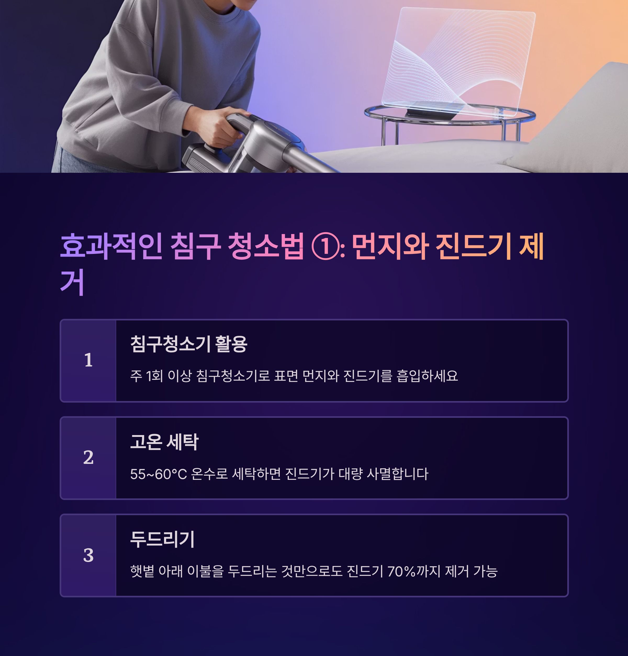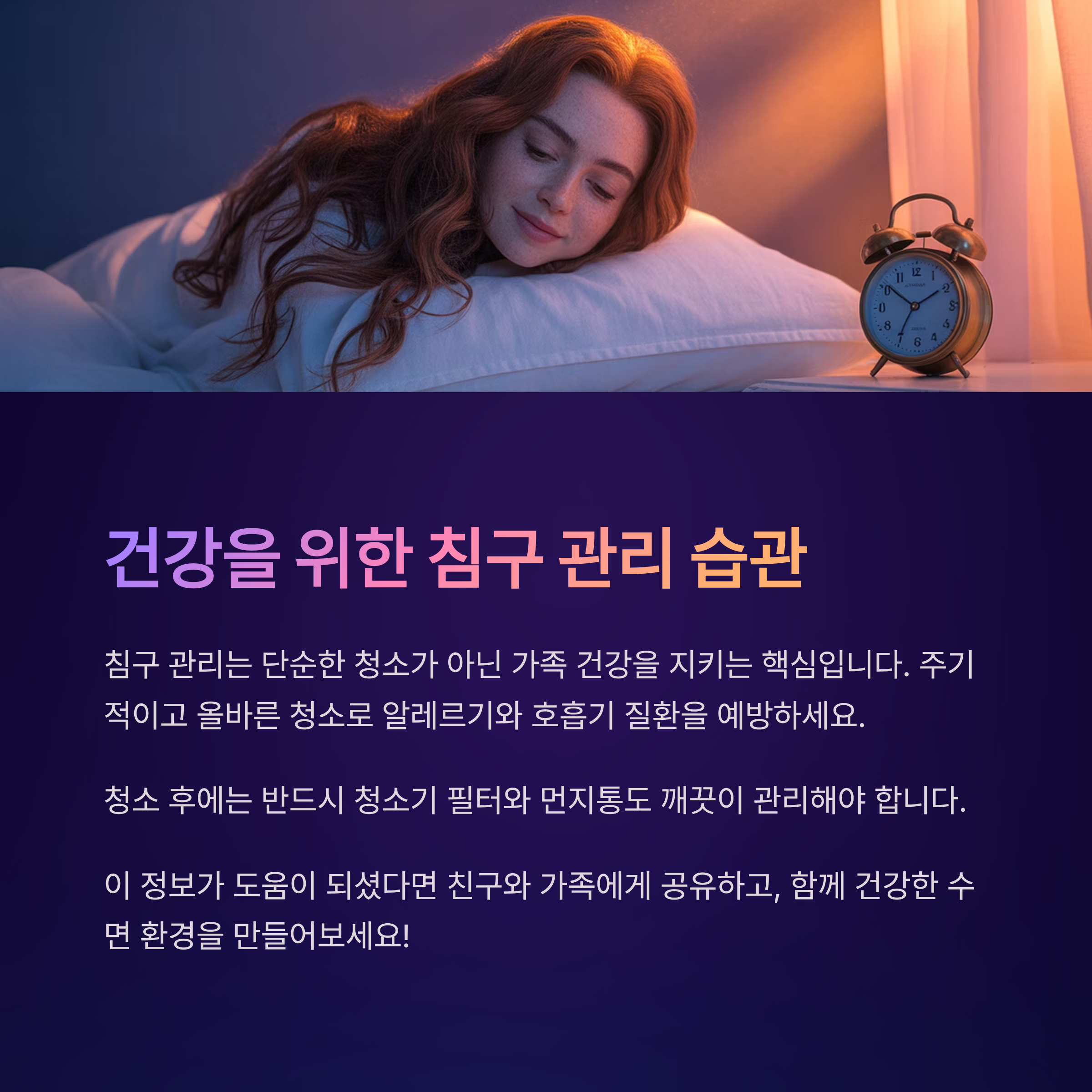 이제부터 매일 간단히 실천할 수 있는 침구 관리 가이드를 드려요!🌟 지치지 않고 꾸준히 건강한 침구 환경을 유지하는 방법, 알고 싶지 않으세요?😉 일상 속 소소한 변화가 본인과 가족의 건강을 함께 지킬 수 있을 테니까요.