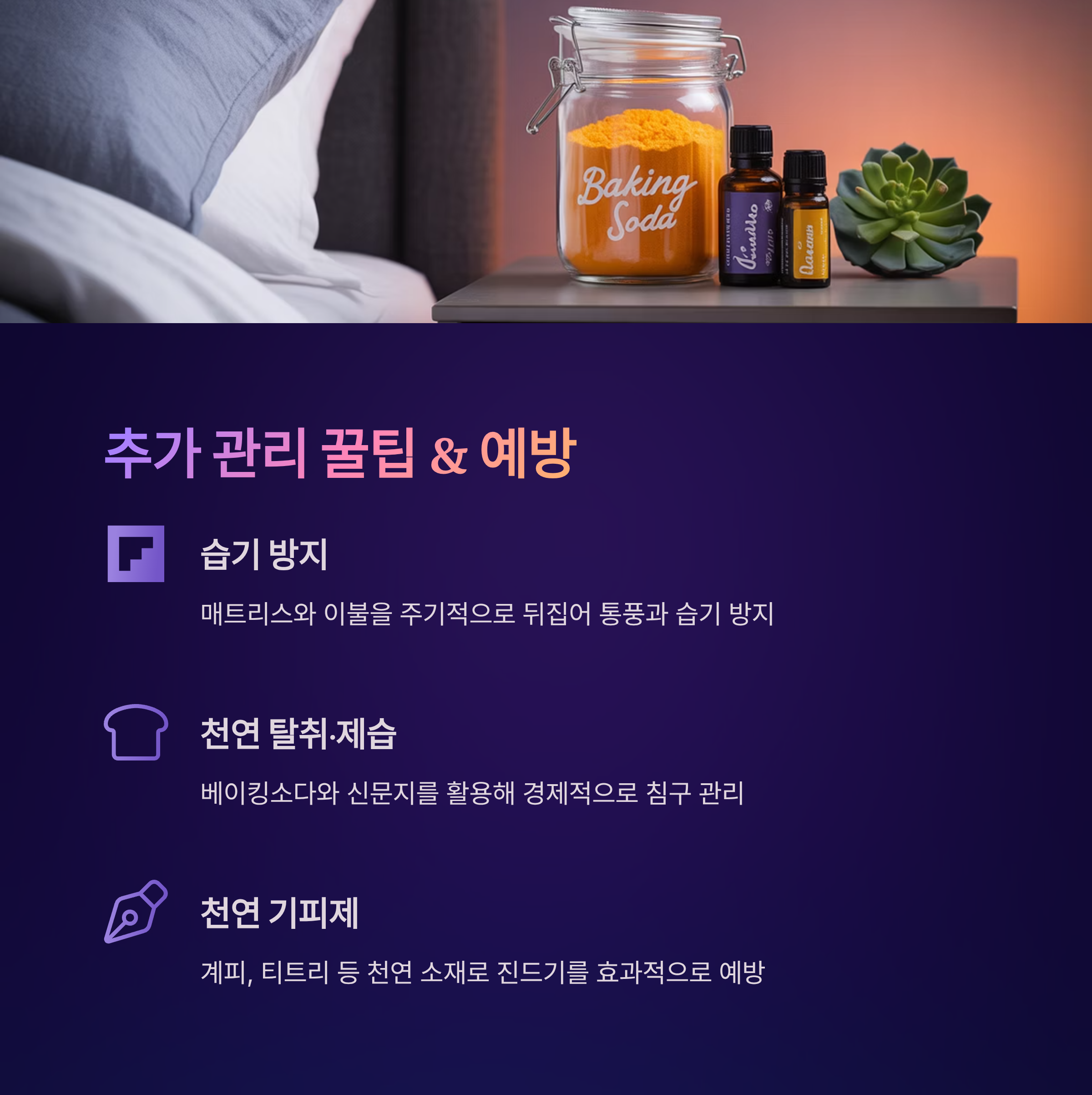 이렇게 다양한 팁과 방법으로 건강한 침구 관리는 물론이고, 가정의 건강도 함께 챙길 수 있습니다.😁 매일 작은 실천들이 쌓이면 진드기로부터 안전하고 깨끗한 침구를 유지할 수 있죠. 지금 바로 관리 시작해보세요. 🌟 깨끗한 침실은 더 나은 생활을 가져다줍니다.
