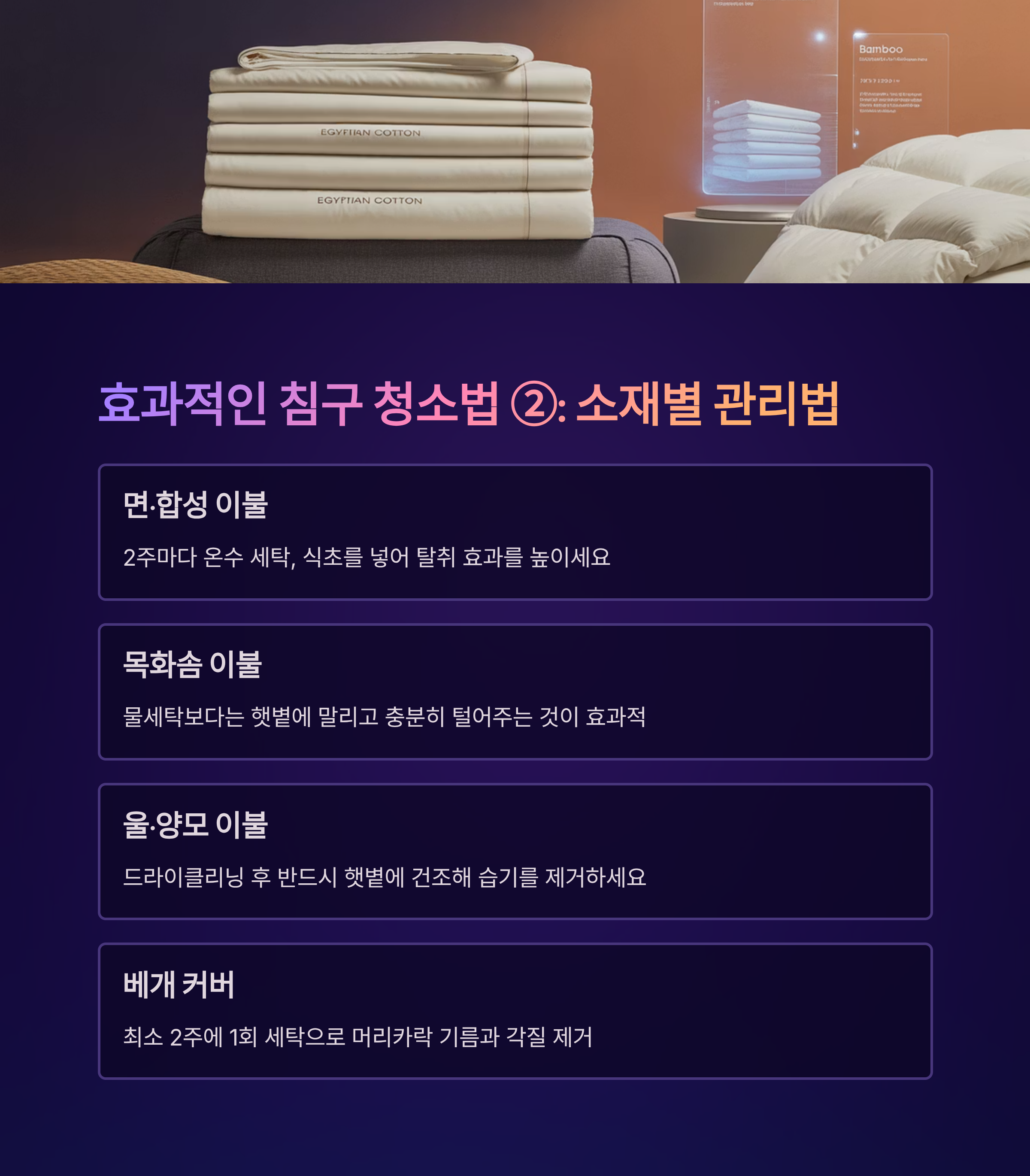 | 침구류 종류 | 권장 세탁 주기 | 특이 관리 사항 |